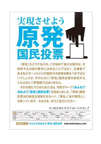 自然を敬い、畏れを感じなくなった私たち。 発展?時代の変遷と共にいまさら致し方ない面もある。しかし、これだけは言える。 「やきもの屋に“核”は要らない。」 http://kokumintohyo.com/ 上記のサイトには署名が二つある。 国民投票実現を訴えるための署名と、東京「原発」都民投票条例/大阪「原発」市民投票条例の制定を直接請求するための署名。 ①国民投票 ネットで署名できます。 http://kokumintohyo.com/apply_form ②大阪市、東京都の条例制定の為の署名 http://kokumintohyo.com/archives/2804 ・大阪市民投票は2012年1月9日締切 ・東京都民投票は2012年2月9日締切 いずれもネット署名ではなく、指定場所に行って署名捺印しなければならない。 自分たち、子供や孫の為に民意を表しましょう。 《国民投票とは》 現代の民主主義国家においては、間接民主制が原則とされているが、議会と一般国民との間に意見の乖離が見られること等を理由として、国民投票を補完的に採用する国が存在する。(wikiより転記) ※日本にはまだない http://ja.wikipedia.org/wiki/%E5%9B%BD%E6%B0%91%E6%8A%95%E7%A5%A8 OurPlanet-TV http://www.ourplanet-tv.org/ 詳しくはこの動画を。 contAct 今井一氏インタビュー |