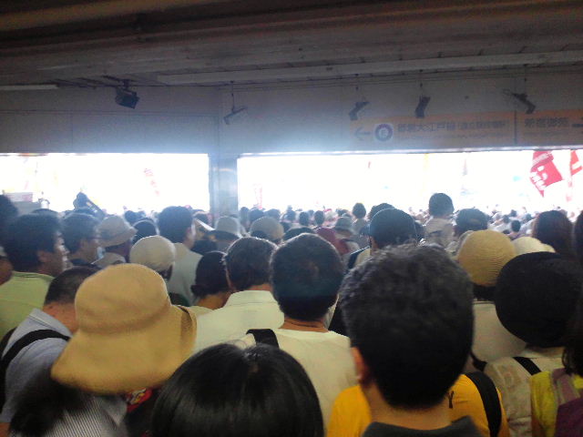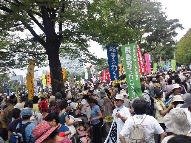 千駄ヶ谷駅に向かう各停電車内で見知らぬおばさんが、「この人たちみんなデモに行ったらすごいね。」と言っていた。 駅に着く。 プラットフォームはすし詰め。 階段もすし詰め。 改札は埋もれてどこにあるのか見えない。 駅を出るとそこらじゅうに市民団体や政党の上りが立ち、脱原発一色の看板がひしめく。 駅構内から外を見る 震災後6ヶ月に合わせ、5万人集めようという集会。あわせて1000万人署名も行われた。 http://sayonara-nukes.org/ 当日の主催者側の発表は6万人。 http://mainichi.jp/select/wadai/graph/20110919/ この日本にあって、とんでもないことだ。 スマフォカメラでは収まりきらず(- -; 参加者は女性が多い。 年齢的には親かもっと上。団塊世代が多い。 「昔は機動隊とやったよね~」と標準語イントネーションで度々聞く。 近畿以西は冷めている。隣の庭での出来事でしかない。 政党側にいたからわからなかったが、動画を見れば結構子供や同世代もいたようだ。 http://www.youtube.com/watch?v=TjLRe2-71NA |