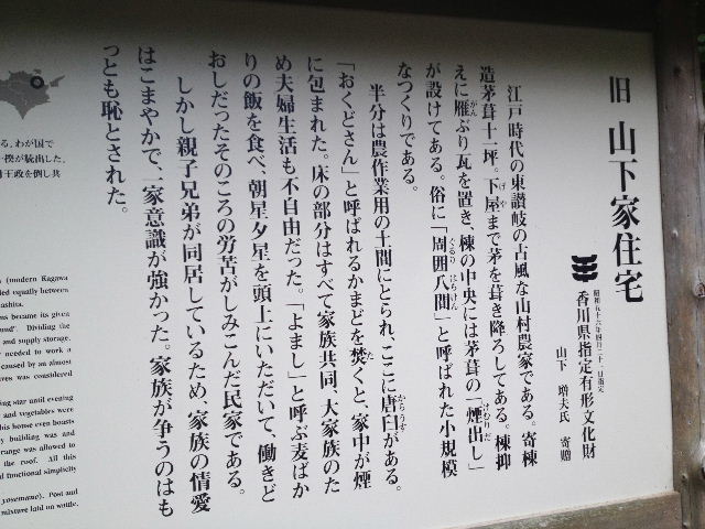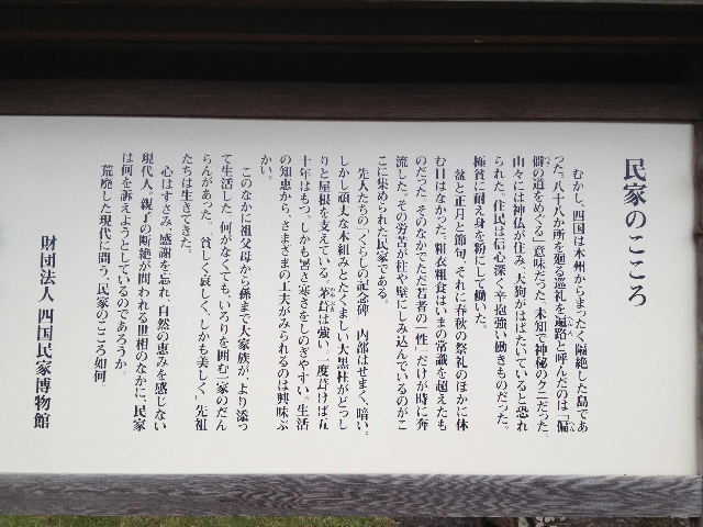 目的の古代山城の石垣は見れず。 http://www.shikokumura.or.jp/ ここには映っていないが、小さなバラ園もあり、山の木々や草花にも名札が付けられている。 広大なんだが、よく手入れされている。歩くだけでも気持ちいい。 ここは開園して35年になるようだ。 ありがちな民俗資料館だが、廃れた感じは無い。 入口にあるこの文章を読んで、入園前から僕は感動に打ちのめされていた。 黒く鈍く外光を反射する民家の匂いにむせ、観光客向けでない生々しい説明文を崇める僕には、何か新しい世界が見えた気がした。 立ち上げ、運営しているのはKATOLECという運送会社。 http://www.katolec.com/index.html 良く見かけるトラックだ。 サイトには、利益の社会還元として設立されたのが四国村と記されている。 今の自分にとって、久々感動したひと時。 |