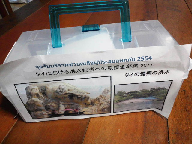 http://www.youtube.com/watch?v=809rzDXdAdc タイの水害被災に対して募金をしろという。 こんなケースに。 ま、中身が見えて良いのか? 嫁はタイ人。 お姉さんは旧国際空港ドンムアン空港の近くに住んでいる。 おそらく水浸しだろう。 ミャンマーとタイの国境付近を流れるチャオプラヤー川は、下流で水上マーケットや暁の寺など寺院めぐりの交通路として使われる。 行かれた事がある方は良く判ると思うが、土地が結構低い。 海面が上がれば当然このようになるだろう。 とりあえず3000円入れておいた。 現在このケースは西浦商事事務所にあり。来客を待ち構えている。 事務所でうちの嫁に出くわそうものなら強制徴収される。 この志は本国の寺へ集約されるそうだ。 ホントにそっくりそのまま届くのか訝しいが、被災された方にはお見舞い申し上げます。 |